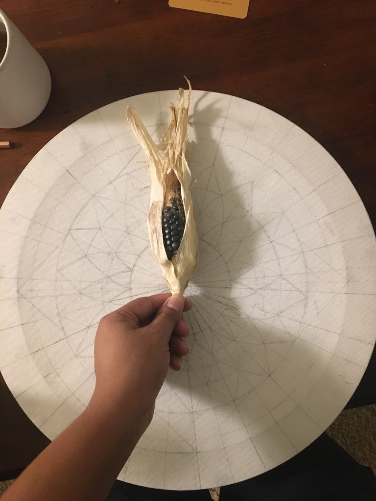 I started this mandala in the winter of 2023 after a full season of farming and cultivating community. I completed it in the spring of 2024. It is hand painted in acrylic and acryla-gouache, and was a devotion to a year of harvest and abundance. The corn in the image was corn I shared and harvested with others (Strawberry Popcorn and Chihuahua Blue Corn). Woven patterns in the piece show give the feeling of a basket and being held. While I did not destroy the piece, as is traditional, I gave it freely to my farm manager after our season together to complete the mandala cycle.