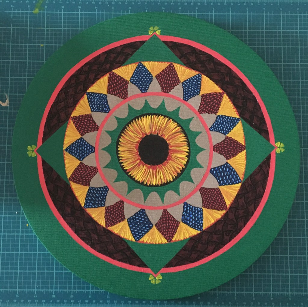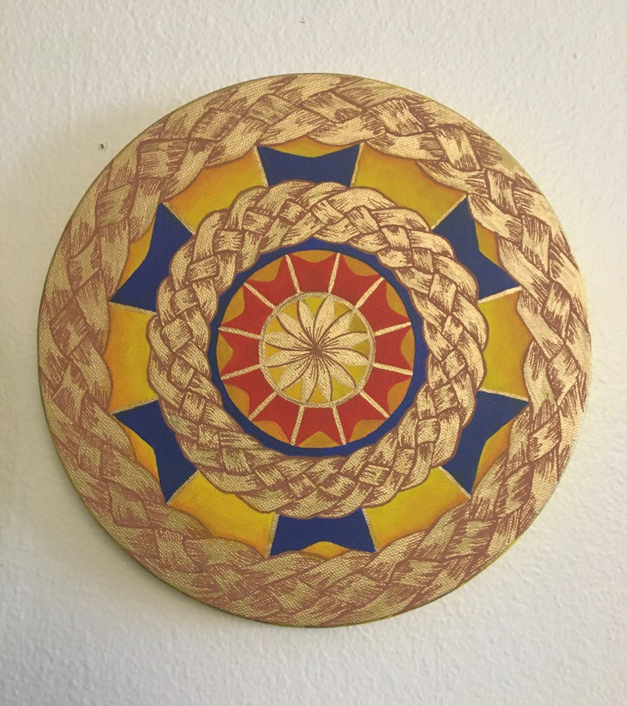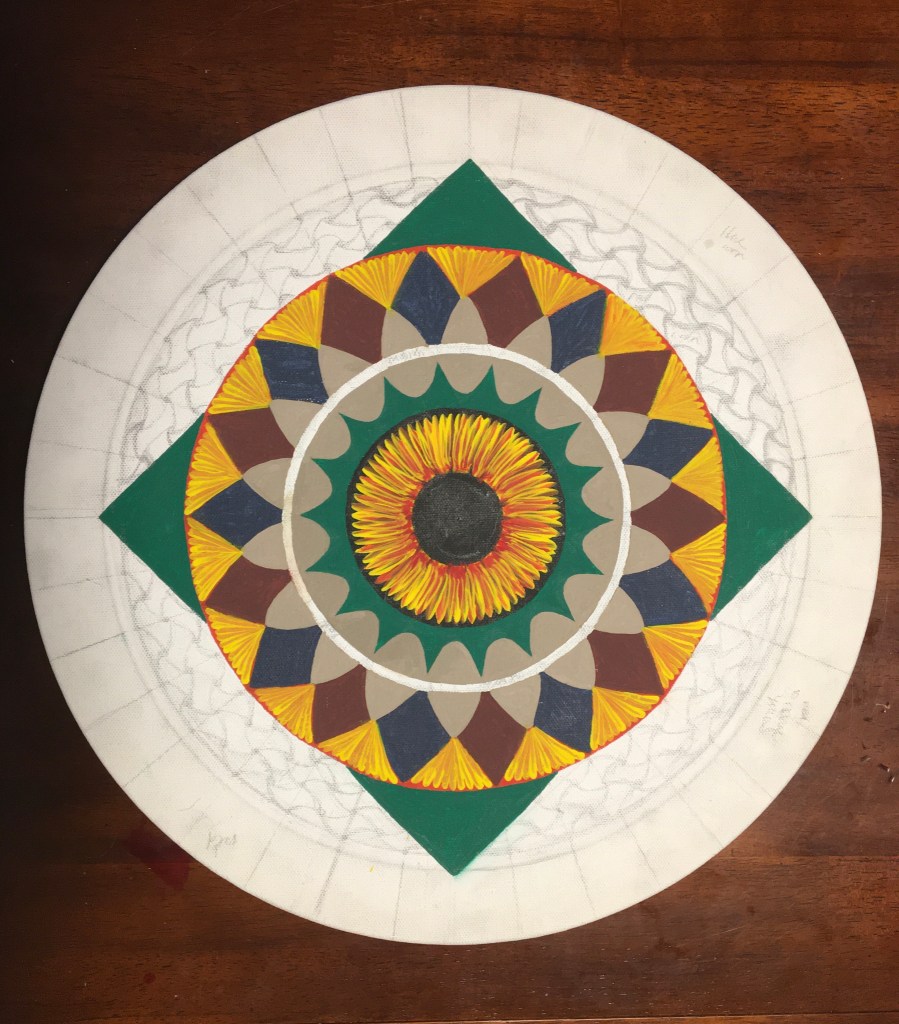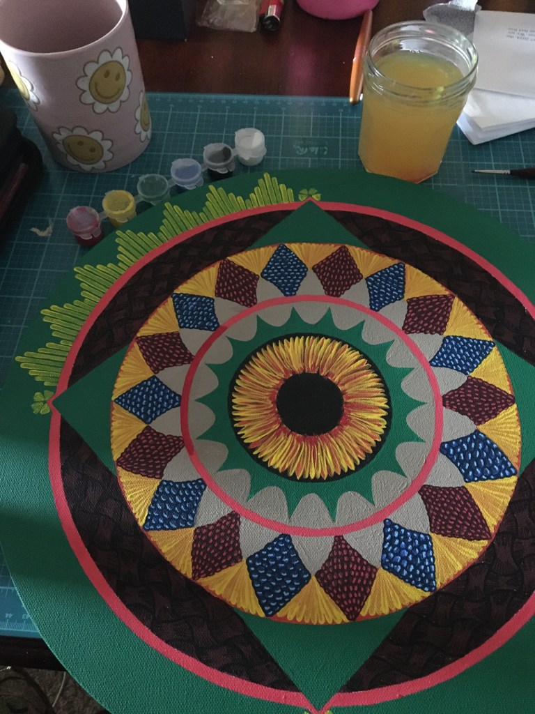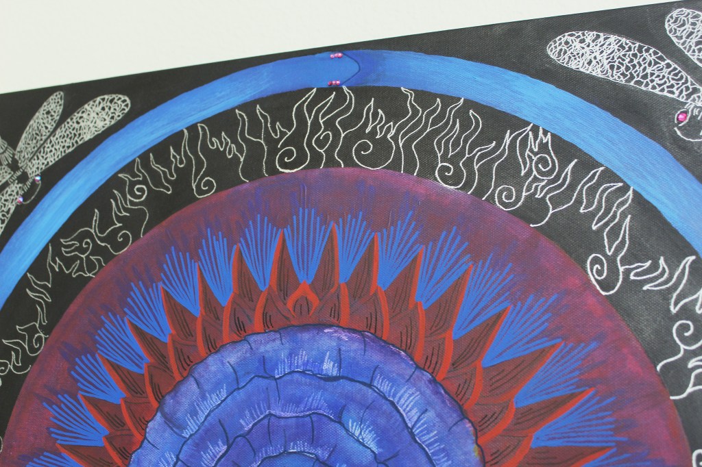 This mandala is hand painted with acrylic and acryla-gouache and is embellished with gemstone accents. It was completed at the beginning of 2025. Its creation was a process of grieving the personal and collective losses of the past half-decade. I felt deeply that there was so much rushing during the COVID-19 Pandemic to get back to “business as usual” without fully honoring the people that died, the land that was lost, the violence that affected so many. I wanted to honor and bury the dead. I wanted the dead and others to know that I haven’t forgotten them.