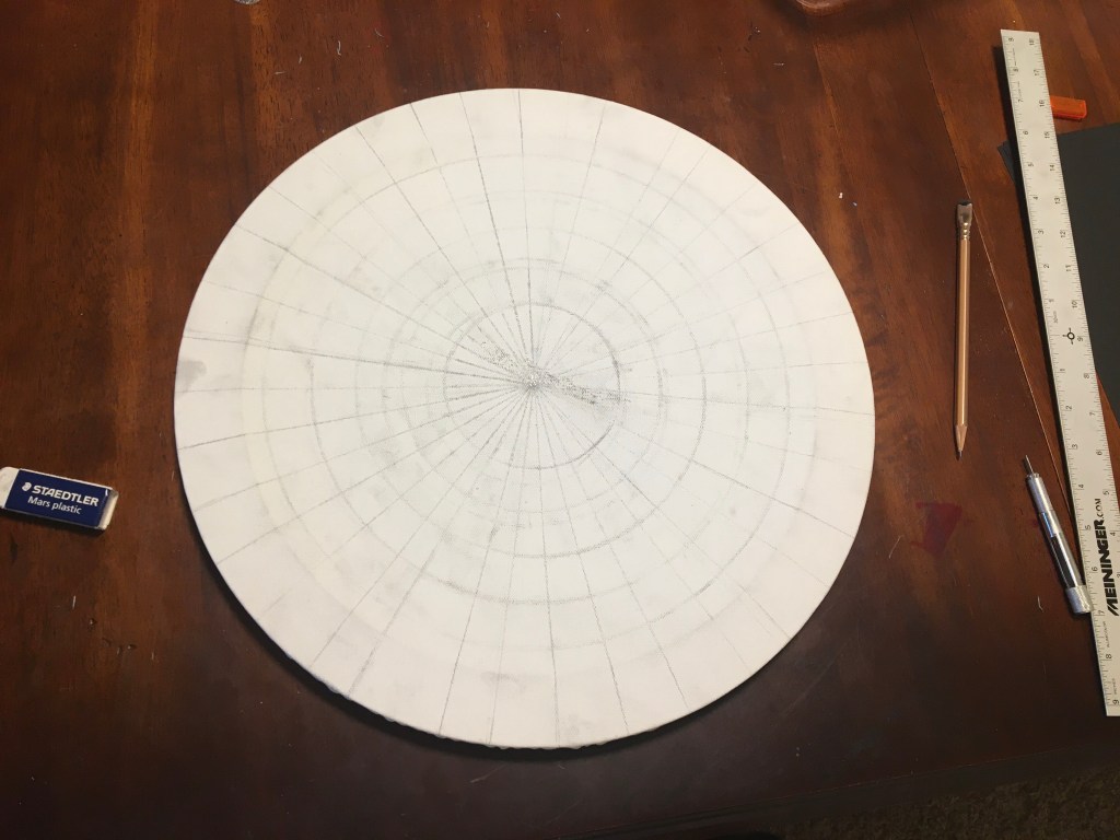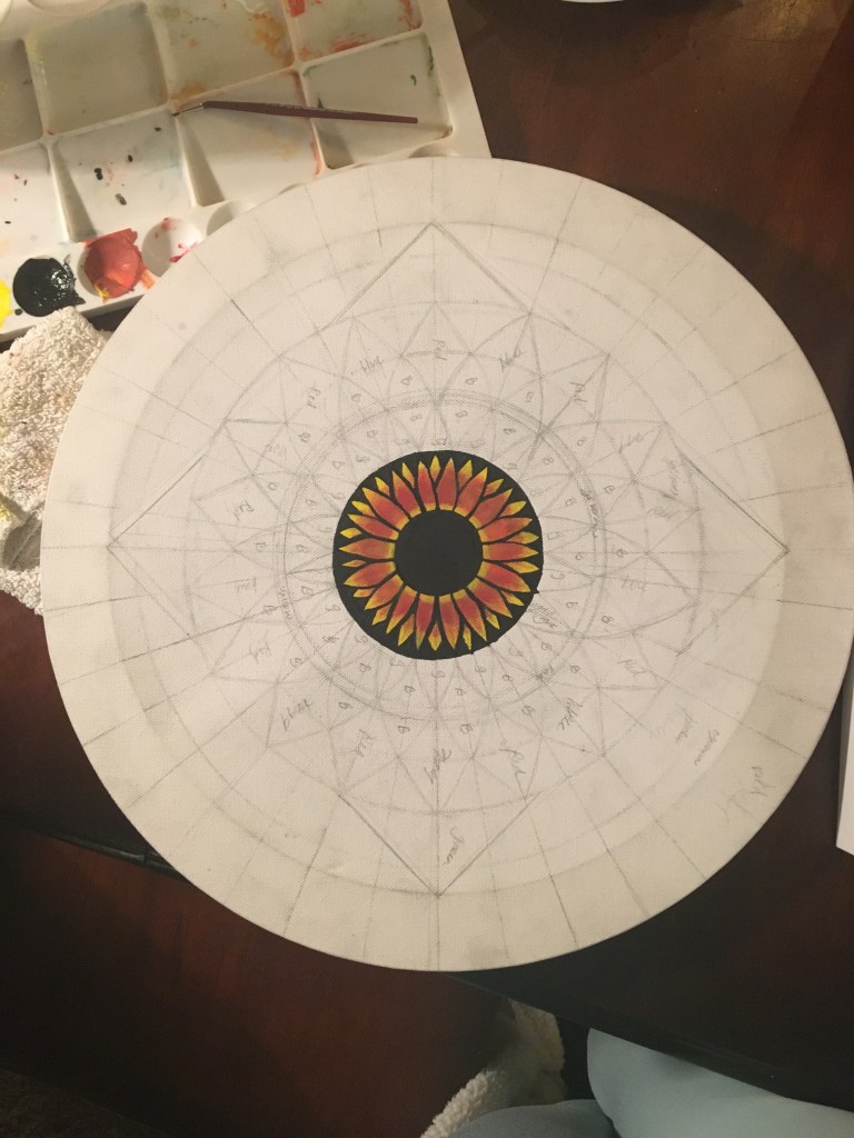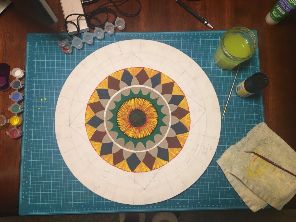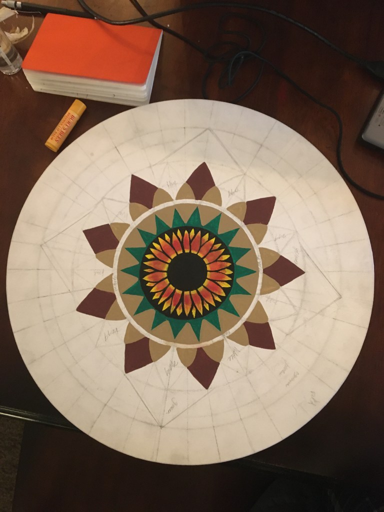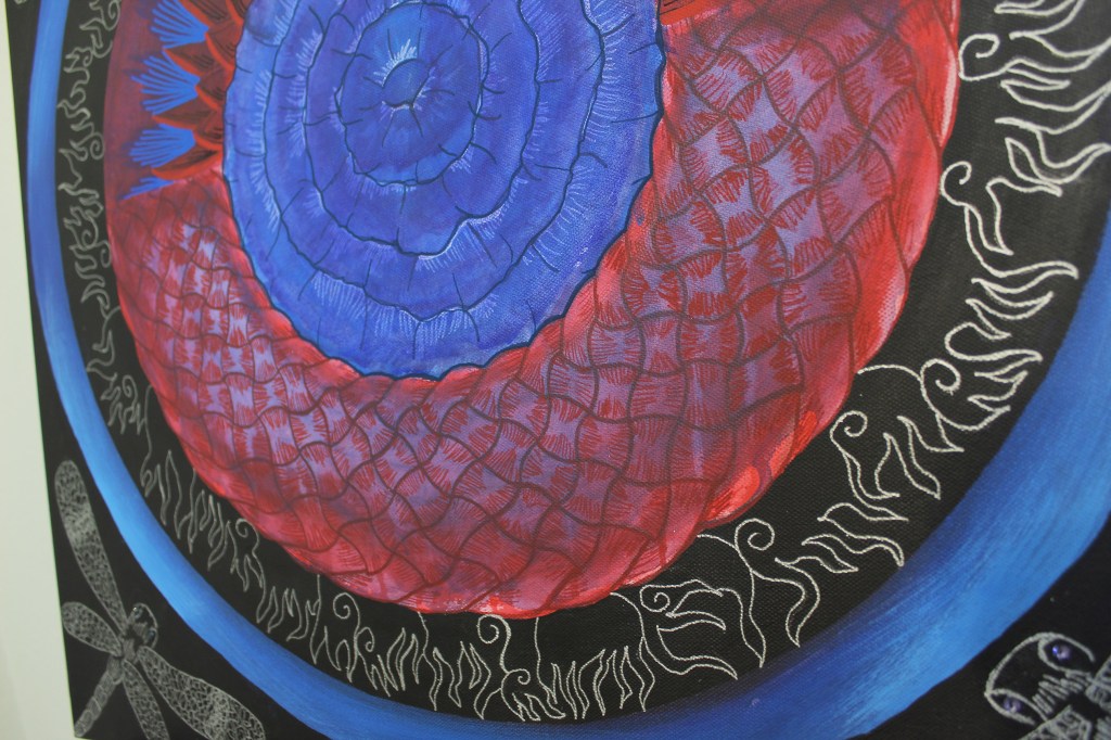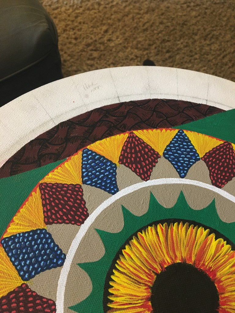 This mandala is hand painted with acrylic and acryla-gouache and is embellished with gemstone accents. It was completed at the beginning of 2025. Its creation was a process of grieving the personal and collective losses of the past half-decade. I felt deeply that there was so much rushing during the COVID-19 Pandemic to get back to “business as usual” without fully honoring the people that died, the land that was lost, the violence that affected so many. I wanted to honor and bury the dead. I wanted the dead and others to know that I haven’t forgotten them.